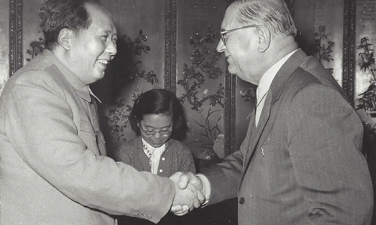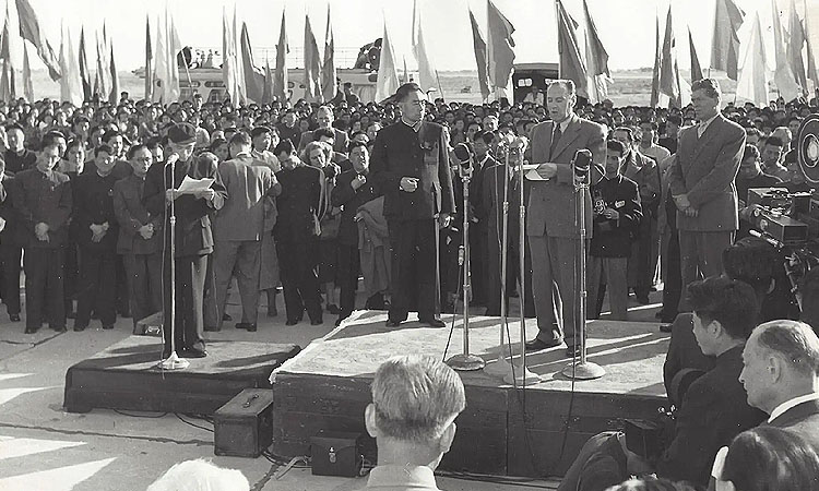 ▶ Kádár első diplomáciai találkozója Mao Ce-tung (Mao Zedong) elnökkel 1957-ben. A kép a magyar küldöttek és kínai vendéglátóik, köztük Mao és Zhou közötti találkozókat ábrázolják. 卡达尔于 1957 年首次与毛泽东主席举行 外交会晤。这张照片描绘了匈牙利代表团 与中方东道主(包括毛泽东和周恩来)之间 的会晤场景